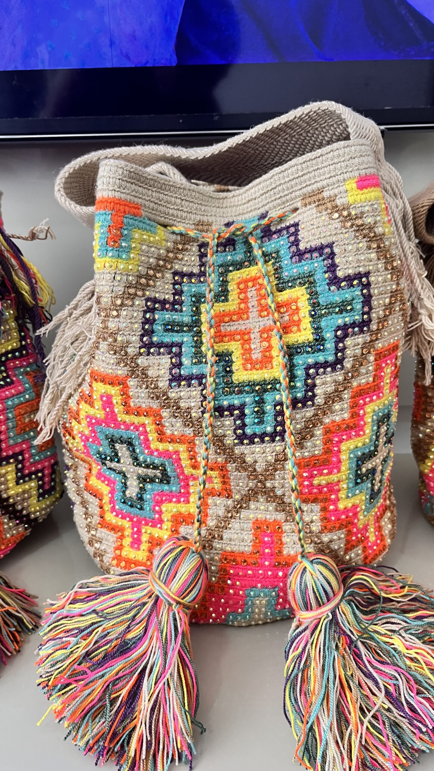 Bolsa Wayuu trabalhada em pedraria toda feita à mão.